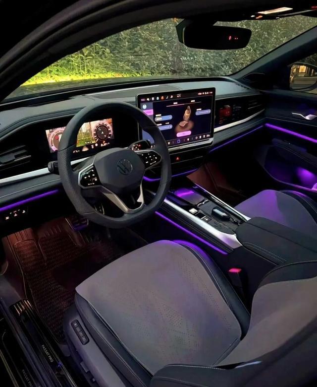 坐进车内,内饰依旧是大众风格:规矩、对称、中规中矩。方向盘是那个新样式的三幅造型,手感很好,皮质包覆还行,就是按键区还是那种触摸式的,老毛病了。中控屏挺大,悬浮样式,但屏幕下边那.些空白区.域略显单调。中控材质我用指甲敲了敲,上半部分是软的,下半部分是硬塑料,明显分界。好在装配工艺还挺紧致,没有异响。我伸手摸了下门板,布料区域不多,这点有点廉价。