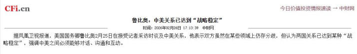 紧接着,美国国务卿鲁比奥也跟着表态,释放出更明确的缓和信号。鲁比奥大家都清楚,之前一直是对华强硬派,因为多次发表不当言论、干涉中国内政,早就被中国列入制裁名单,按规定不能进入中国境内。可就在 2 月 25 日,鲁比奥公开接受采访,说了两个关键信息:第一,中美战略关系已经到达一个稳定点;第二,他预计在 3 月 31 日跟着特朗普一起访华。一个被中国制裁的官员,主动说要跟着总统访华,态度转变非常明显,这也从侧面印证,美国现在是真心想缓和对华关系,而不是装样子。
